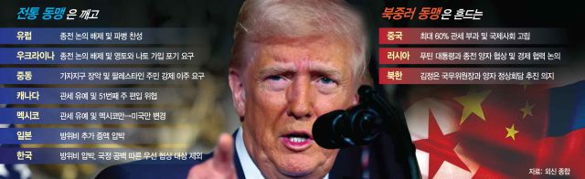 한편 바이든 행정부가 약속했던 자유주의 진영 동맹이 흔들리면서 전통의 우방국들은 대응책 마련에 전전긍긍하는 분위기다. 미국에 대한 경제·안보적 의존을 줄일 수 없는 일본과 인도는 천문학적인 방위비 인상 압박과 보복 관세 우려에 쩔쩔매고 있으며 한국은 국정 공백 속에 제대로 된 협상판도 만들지 못하고 있다. 17일 프랑스 파리에서 종전 문제로 다급하게 머리를 맞댄 유럽 정상들은 19일 캐나다까지 소집해 다시 한 번 회동하기로 했다.