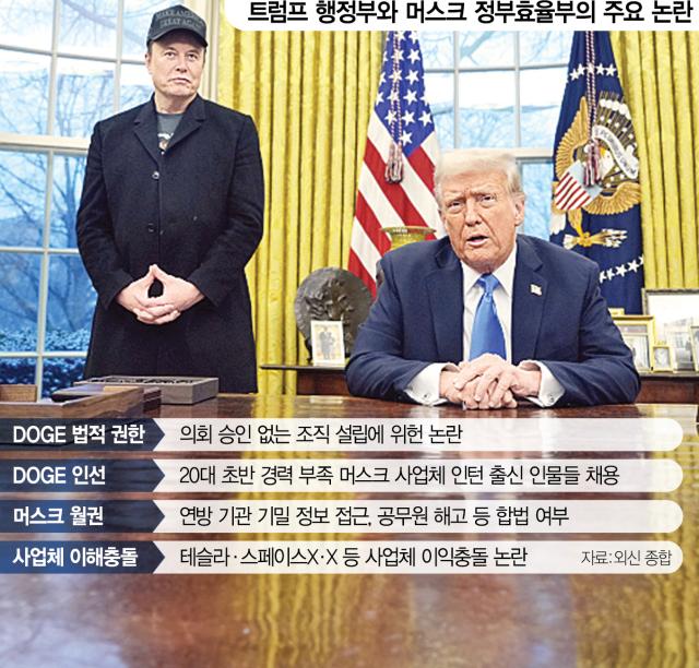 트럼프와 머스크는 자신들의 밀착이 연방법 위반, 이해 충돌 등 위헌 요소가 있다는 일부 언론의 지적에 대해서는 ‘딥스테이트(Deep State)’의 저항으로 규정하고 있다며 강하게 반발했다. ‘그림자 정부’로도 불리는 딥스테이트는 정부 내에서 민주당의 이익을 추구하는 관료 집단이 정책을 좌지우지 한다는 음모론이다. 머스크는 워싱턴DC에서 민주당 후보였던 카멀라 해리스 전 부통령의 지지율이 92%에 달했다며 “대통령과 내각에 완강히 반대하는 선출되지 않은 관료 권력(bureaucracy)이 있다”며 “국민이 뽑은 대표인 대통령의 의지가 이행되지 않는다면 민주주의국가가 아닌 관료주의 속에서 살고 있다는 것을 의미한다”고 주장했다. 트럼프도 “그들(반대자들)이 가장 먼저 헌법을 위반하고 있다”며 “자신이 무슨 말을 하는지도 모르는, 국가에 해로운 사기꾼들”이라고 맹비난했다.