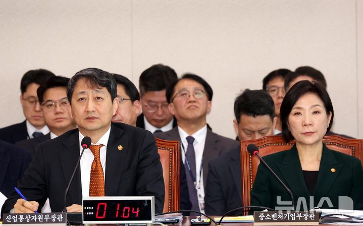 [서울=뉴시스] 조성봉 기자= 안덕근 산업통상자원부 장관이 19일 오전 서울 여의도 국회에서 열린 산업통상자원중소벤처기업위원회 전체회의에서 의원들의 질의에 답변하고 있다. 오른쪽은 오영주 중소벤처기업부 장관. 2025.02.19. suncho21@newsis.com