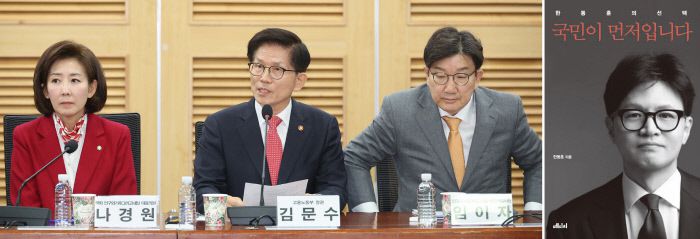너도나도 ‘때가 왔다’ 김문수 고용노동부 장관(왼쪽 사진 가운데)이 19일 국회 의원회관에서 열린 ‘2030·장년 모두 Win-Win하는 노동개혁 대토론회’에서 발언하고 있다. 오른쪽은 한동훈 전 국민의힘 대표가 출간하는 책 표지. 연합뉴스·메디치미디어 |
