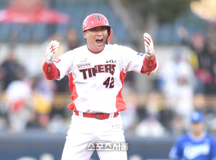 KIA 김태군이 지난해 10월 23일 광주기아챔피언스필드에서 열린 삼성과 2024 KBO 한국시리즈 1차전 8회말 2사1루 1타점 좌중간 2루타를 친 후 환호하고 있다.  사진 | 광주=최승섭기자