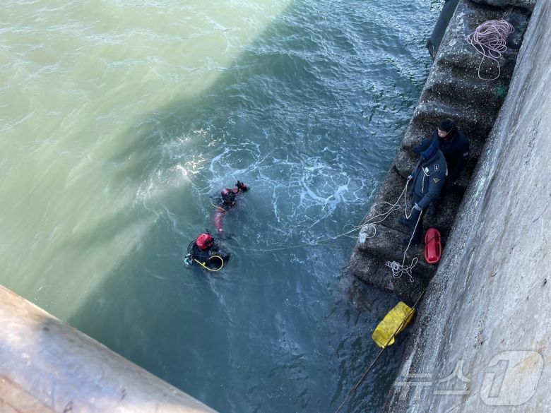 19일 서천 마량진항 바다에 빠진 승용차를 수색하기 위해 해경 잠수부들이 투입 중인 모습. (보령해양경찰서 제공. 재판매 및 DB금지) /뉴스1 |