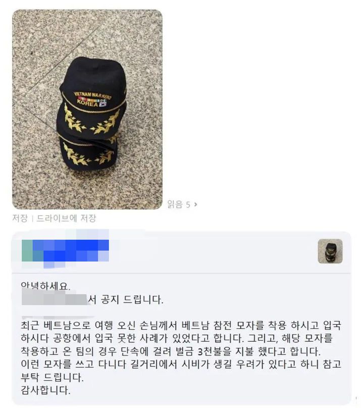 [서울=뉴시스] 한국인이 월남전 참전 기념 모자를 쓰고 베트남에 입국하려다가 거부당한 사연이 전해져 화제다. (사진= 온라인 커뮤니티 캡처 ) 2025.02.21. photo@newsis.com *재판매 및 DB 금지 |
