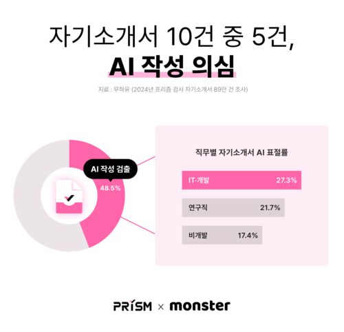 무하유에 따르면 지난해 89만건의 자기소개서 중 48.5%가 생성형 AI 활용 의심으로 나타났다. 해당 자기소개서는 금융권, 공공기업 및 공공기관, 일반 기업 등 프리즘 서비스를 이용하는 고객사들의 데이터를 기반으로 했다.