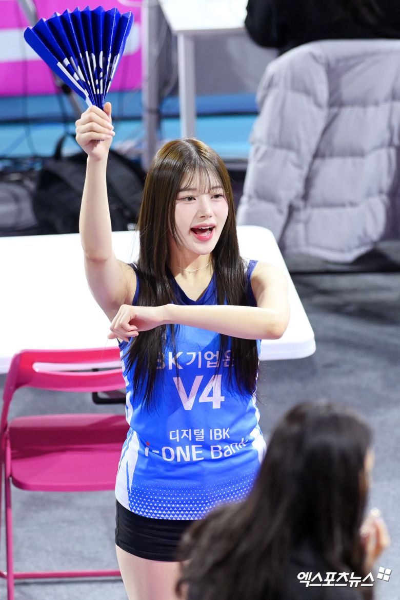(엑스포츠뉴스 인천, 고아라 기자) 25일 오후 인천 부평구 삼산월드체육관에서 열린 ‘도드람 2024-2025 V-리그’ 흥국생명과 IBK기업은행의 경기, IBK기업은행 이예빈 치어리더가 열띤 응원을 펼치고 있다.