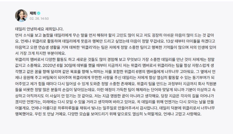 먼저 소식을 보고 놀랐을 데일리에게 무슨 말을 먼저 해줘야 할지 고민도 많이 되고, 저도 굉장히 아쉬운 마음이 많이 드는 것 같아요. 언제나 위클리로 활동하며 데일리에게 웃음과 행복만 드리고 싶었는데, 마음이 정말 무겁네요.