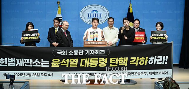 전한길 강사와 자유민주시민회의, 세이브코리아는 이날 국회 소통관에서 기자회견을 열고 헌법재판소에 "심각한 절차적 하자를 안고 불충분한 증거만으로 윤석열 대통령 탄핵을 인용한다면 헌재는 전 국민적 저항을 각오해야만 할 것"이라고 경고했다.