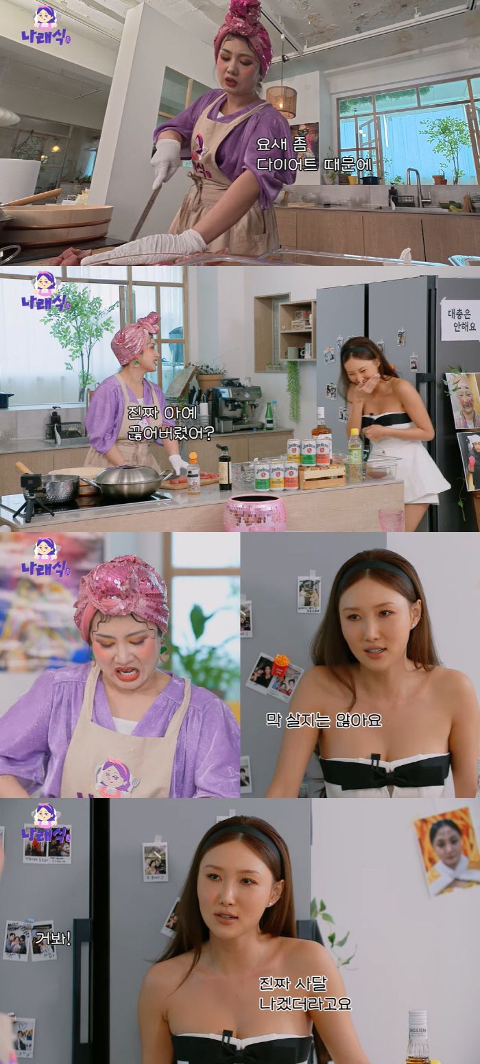 이날 화사는 예전보다 더욱 슬림해진 모습으로 등장, 박나래와 반갑게 인사를 나눴다. 박나래는 "다이어트 중이니 지라시 스시를 준비했다"라며 바삐 음식을 준비했다. 전복술찜, 단새우, 우니까지 한가득 준비된 모습에 화사는 "회도 뜨는 건가요? 오마카세느낌인데? 사랑해요"라며 설렘을 드러냈다.