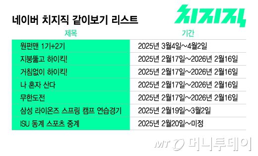 네이버는 치지직에서 다양한 장르의 같이보기를 진행하고 있다. 미쉐린 가이드 외에도 '지붕뚫고 하이킥!', '무한도전' 등 두꺼운 팬층을 보유하며 다시보기 수요가 높은 인기 콘텐츠 같이보기를 진행 중이고 '삼성 라이온즈 스프링캠프 연습경기', '2025 하얼빈 동계아시안게임' 등 스포츠 방송도 진행한다. 이 밖에도 '제39회 골든디스크어워즈', '2024 노벨상' 등 시상식 방송도 진행했다.