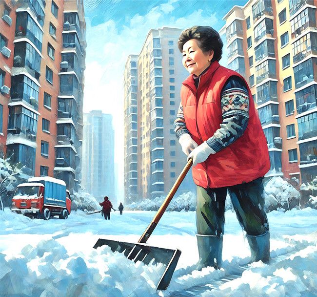 김의경 작가가 생성형 인공지능(AI) ‘빙 이미지 크리에이터’에 “고층 아파트에서 빨간 조끼를 입은 짧고 검은 머리의 아시아 할머니 미화원이 쌓인 눈을 삽으로 치우는 모습을 유화처럼 그려줘”라는 지시어를 입력해 생성한 이미지이다. |