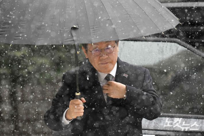 이재명 더불어민주당 대표가 4일 서울중앙지법에서 열린 '대장동 사건' 공판에 출석하고 있다. 이번 공판은 법관 정기인사로 재판부가 교체된 이후 처음 열리는 재판이다.