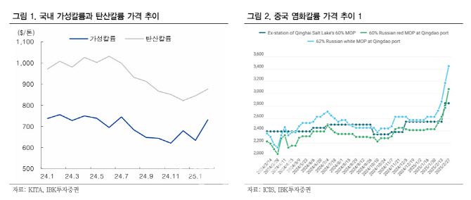 메이저 칼륨 업체인 벨라루스칼리가 인프라 보수를 위해 올해 상반기 동안 염화칼륨 생산을 100만톤(세계 수요의 1.3~1.4% 수준) 감축하는 점도 염화칼륨 가격 반등을 이끄는 요인으로 작용하고 있다. 또한 미국이 캐나다산 제품에 대한 관세를 부과할 것으로 보인다. 미국은 캐나다에서 연간 약 1200만톤 규모의 염화칼륨을 수입하고 있는데, 관세 부과로 인한 추가적인 수입 가격 상승이 전망된다.