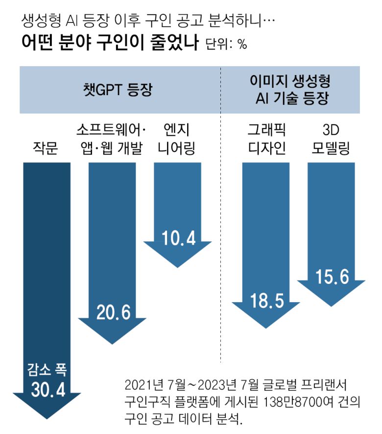 이는 챗GPT가 단순하고 반복적인 작업을 자동화할 수 있기 때문으로 해석된다. 특히 △작문(―30.4%) △소프트웨어·앱·웹 개발(―20.6%) △엔지니어링(―10.4%) 분야에서 감소 폭이 두드러졌다. 이는 생성형 AI가 글쓰기와 코딩, 자동화와 관련된 반복적인 업무를 대체하면서 프리랜서 시장의 수요 감소로 이어졌음을 시사한다.