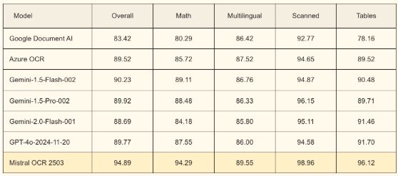 미스트랄 OCR은 벤치마크 테스트에서 구글 '도큐먼트 AI', '애저 OCR', 오픈AI 'GPT-4o' 등 주요 모델보다 뛰어난 성능을 보였다. 특히, 수학 인식과 문서 스캔, 다국어 텍스트 처리 부문에서 가장 높은 정확도를 기록했다.