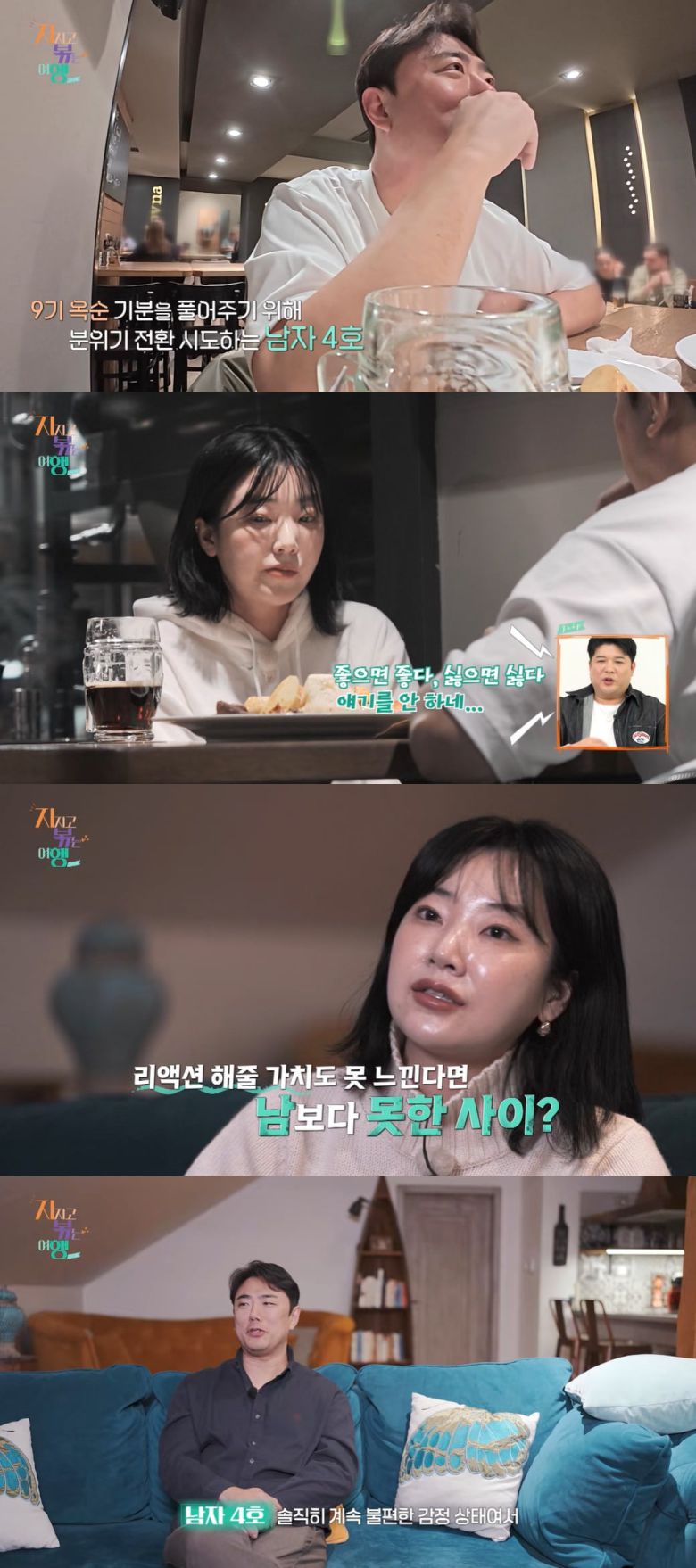 맥주를 마시러 간 두 사람은 여행 일정을 얘기하다가도 틀어졌고, 남자 4호가 농담으로 분위기를 풀어보려 했지만 9기 옥순은 무반응으로 일관했다.