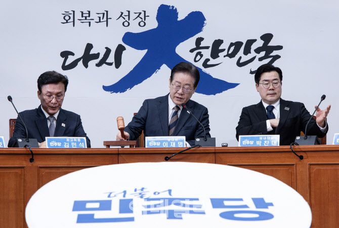 이재명 더불어민주당 대표가 10일 오전 서울 여의도 국회에서 열린 최고위원회의에서 의사봉을 두드리고 있다.(사진=뉴스1) |