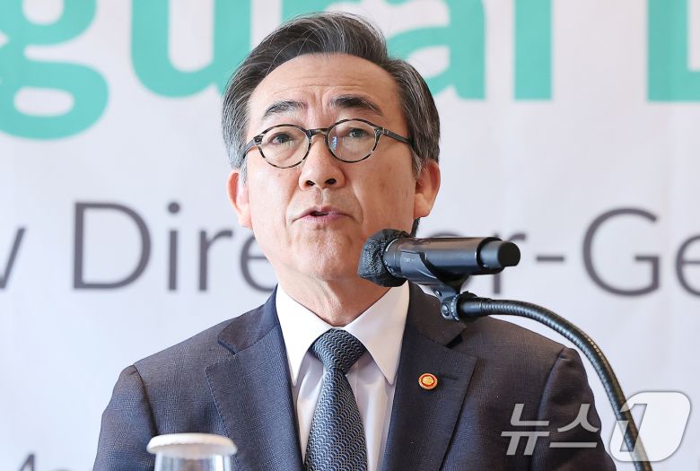 (서울=뉴스1) 김진환 기자 = 조태열 외교부 장관이 11일 서울 중구 웨스틴 조선호텔에서 열린 김상협 글로벌녹색성장연구소(GGGI) 사무총장 취임식에 참석해 축사를 하고 있다. 2025.3.11/뉴스1