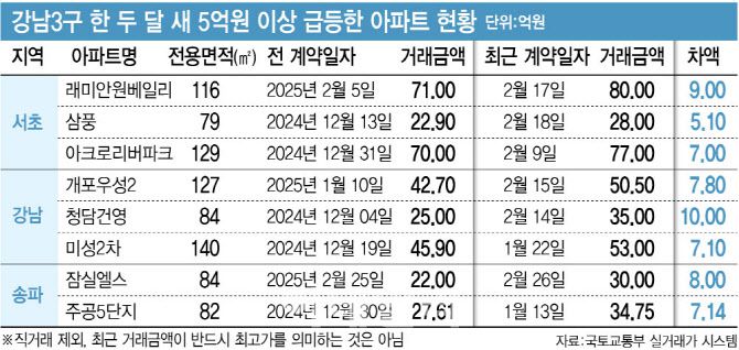 강남구 개포우성2차 아파트 127㎡는 2월 15일 50억 5000만원에 거래됐다. 이는 한 달 전, 1월 10일 42억 7000만원보다 7억 8000만원 급등한 것이다. 송파구 잠실엘스 84㎡ 아파트는 2월 25일 22억원에 거래됐으나 26일엔 30억원에 거래됐다. 잠실 주공5단지는 토허제가 여전히 유지되고 있지만 82㎡ 아파트가 작년 말 27억 6100만원에서 1월 13일 34억 7500만원으로 한 달 만에 7억 넘게 뛰었다. 단기간에 가격 급등락이 활발해 시세를 종잡을 수 없는 경우도 있었다. 서초구 아크로리버파크 129㎡(52평)는 작년 11월 79억 8000만원으로 최고가를 찍었다가 작년 말 70억원으로 떨어지더니 지난달 77억원으로 다시 올랐다.