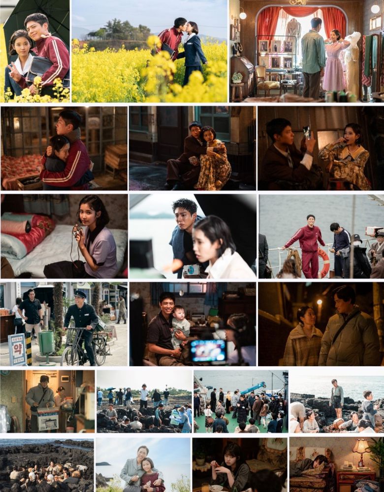 함께 공개된 비하인드 스틸과 미공개 스틸은 '폭싹 속았수다' 1막을 장식한 배우들의 화기애애한 촬영 현장은 물론 과거부터 현재까지의 시간 흐름을 느낄 수 있는 다양한 모습이 담겨 눈길을 사로잡는다. 먼저 노란 유채꽃밭에서 브이를 하거나 수줍게 뽀뽀하는 ‘애순’(아이유)과 ‘관식’(박보검)의 스틸은 훈훈함을 자아낸다. 서로를 바라보고 웃거나, 부둥켜안고 울거나, 카메라 밖에서 장난기 가득한 모습까지. 극 중 요망진 ‘애순’과 팔불출 ‘관식’의 매력을 그대로 보여주며 흥미를 자극한다. 스틸 속 환하게 웃고 있는 박보검의 모습들은 촬영 현장이 작품만큼이나 따뜻하고 활기 넘쳤음을 짐작케 한다. 또한, 모니터링에 열중하고 있는 아이유와 울먹거리는 듯한 박보검의 모습은 ‘애순’과 ‘관식’을 더욱 생생하게 표현하기 위한 두 배우의 노력을 엿볼 수 있게 한다. 여기에 서로를 바라보는 중년 ‘애순’(문소리)와 ‘관식’(박해준)의 스틸은 시간이 흘러도 변함없이 함께하고 있는 둘의 모습을 보여주며 감동을 전한다. 촬영 현장에서 열심히 디렉팅을 하는 김원석 감독의 모습 또한 그의 열정이 고스란히 느껴지며, 그의 섬세한 연출이 담긴 '폭싹 속았수다'의 앞으로의 이야기도 기대하게 만든다. 해녀 이모들 ‘충수’, ‘양임’, ‘경자’ 역의 차미경, 이수미, 백지원, 그리고 ‘애순’의 엄마 역의 염혜란과 어린 ‘애순’ 역의 김태연이 함께 웃고 있는 모습은 유쾌했던 촬영 현장의 분위기를 보여준다. ‘금명’의 스틸 역시 2막에서 본격적으로 펼쳐질 그의 이야기에 대한 호기심을 불러일으킨다.