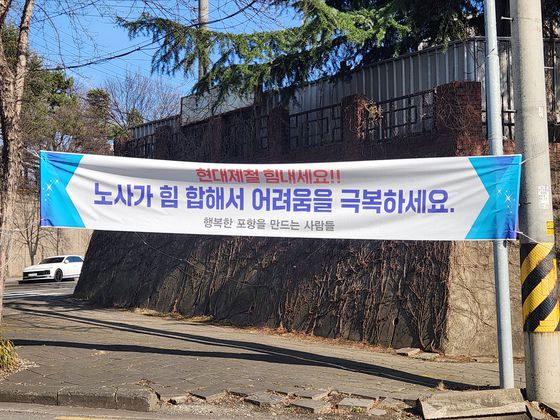 12일 오후 경북 포항시 남구 포항철강산업단지 현대제철 포항2공장 인근에 노동조합이 경영악화와 고용불안에 대해 항의하는 내용의 현수막을 걸어둔 모습. 김정석 기자