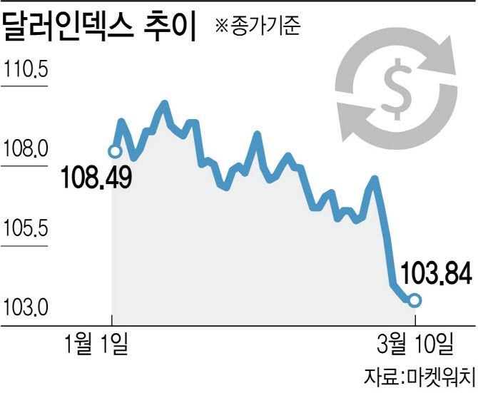 특히 최근 달러가 약세 기조로 돌아섰음에도 원·달러 환율이 높은 수준을 유지하고 있다는 점은 주목된다. 미국, 중국 등에 연일 관세를 부과하면서, 미국의 소비자물가 부담이 커지고 경기 둔화를 부추길 것이란 우려가 커졌다. 이에 주요 6개국 통화 대비 달러 가치를 나타내는 달러인덱스가 103포인트까지 떨어지면서 약 5개월 만에 최저치로 떨어졌다. 연초대비 환율은 0.6% 떨어지는데 그쳤으나, 같은 기간 달러인덱스는 4.3%나 하락했다.