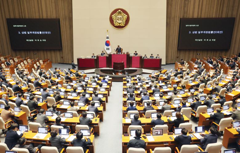국회는 이날 본회의를 열고 상법 개정안을 재석 279명 중 찬성 184명, 반대 91명, 기권 4명으로 가결했다. 개정안은 더불어민주당과 개혁신당 등 야당 주도로 통과됐다. 상법 개정안은 이사의 충실 의무 대상을 기존 회사에서 회사 및 주주로 확대하고, 전자주주총회 도입을 의무화하는 내용이다. 민주당은 주주 보호를 통한 주식시장 정상화 등을 강조하며 앞서 법제사법위원회에서 일방 처리했다.