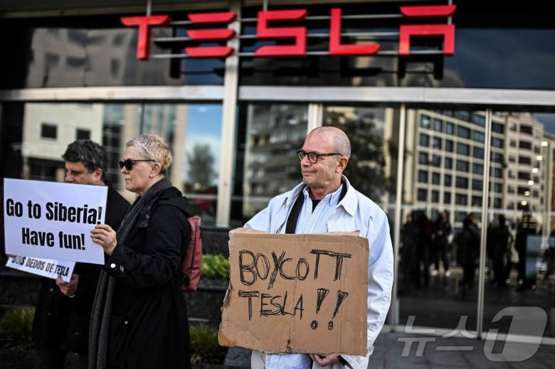 2025년 3월9일 테슬라 최고경영자(CEO) 일론 머스크에 대한 반감에 포르쿠갈 리스본의 한 테슬라 매장 앞에서 시민들이 시위하고 있다. ⓒ AFP=뉴스1