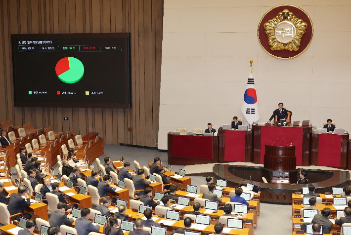 13일 국회 본회의에서 상법 일부개정법률안이 통과되고 있다. 상법 개정안은 이사가 충실해야 하는 대상을 기존의 '회사'에서 '회사 및 주주'로 넓히고, 상장 회사의 전자 주주총회 도입을 의무화하는 조항 등을 담고 있다. 연합뉴스