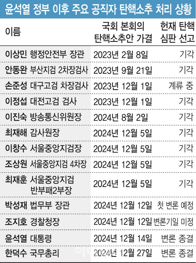 야당이 주도한 주요 공직자 연쇄 탄핵소추가 잇달아 기각되면서 윤석열 대통령 탄핵심판에도 영향을 미칠지 관심이 모아진다. 윤 대통령 측이 ‘야당의 연쇄 탄핵으로 인한 국정마비’를 12·3 비상계엄 선포 이유 중 하나로 꼽고 있기 때문이다.
