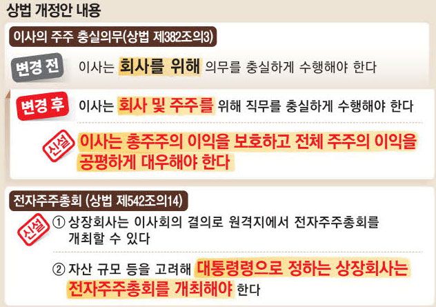 민주당은 이 같은 내용의 상법 개정안을 지난해 11월 당론으로 정한 뒤 강하게 추진해왔다. 이사의 주주 충실의무를 신설하면 만성적인 한국 주식 저평가를 해소하고 기업 경쟁력을 높일 수 있다고 주장했다.