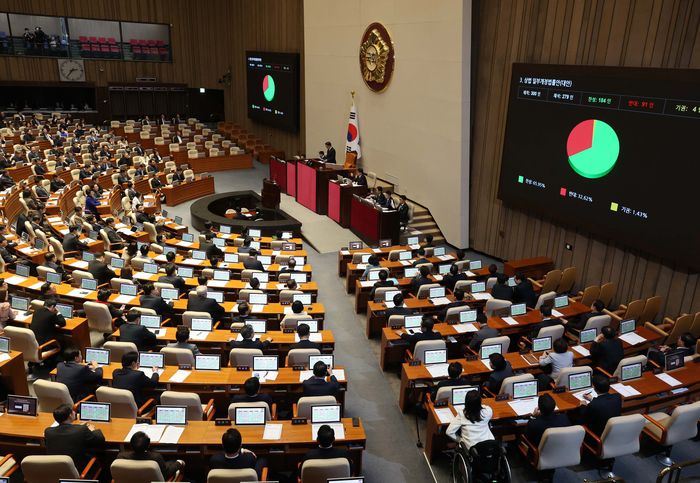 13일 서울 여의도 국회에서 열린 본회의에서 상법 개정안이 통과되고 있다. 이날 상법 개정안은 재석 279명에 찬성 185명, 반대 91명, 기권 3명으로 가결됐다. [한주형 기자]