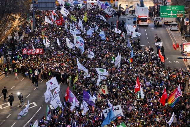 ▲16일에도 서울 종로구 광화문 인근에서 윤석열 대통령 파면을 촉구하는 집회가 열렸다. 사진은 지난 15일 열린 윤석열 즉각퇴진·사회대개혁 비상행동의 집회 장면. ⓒ연합뉴스 |
