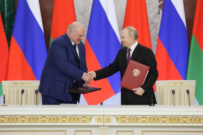 블라디미르 푸틴 러시아 대통령(오른쪽)과 알렉산데르 루카셴코 벨라루스 대통령이 13일(현지시간) 러시아 모스크바 크렘린궁에서 회담한 후 서명한 공동 문서를 교환하면서 악수를 나누고 있다./타스·연합 |