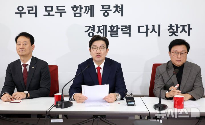 [서울=뉴시스] 조성우 기자 = 권성동(가운데) 국민의힘 원내대표가 16일 오후 서울 여의도 국회에서 열린 현안 관련 기자간담회에서 발언하고 있다. 2025.03.16. xconfind@newsis.com