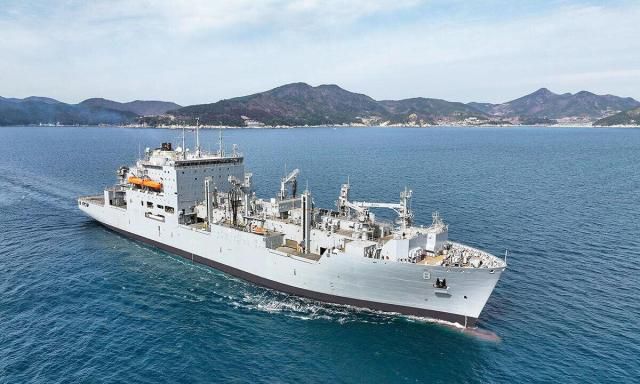 미국 해군 군수지원함인 ‘월리 쉬라’호가 함정 정비를 성공적으로 마치고 출항하고 있다. [사진=한화오션]