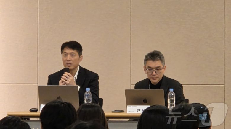 김석환 위믹스 재단(WEMIX PTE. LTD) 대표와 안용운 위메이드 CTO가 17일 위메이드 사옥에서 열린 긴급 간담회에서 질문에 답을 하고 있다. 2025.03.17 ⓒ 뉴스1 손엄지 기자 |