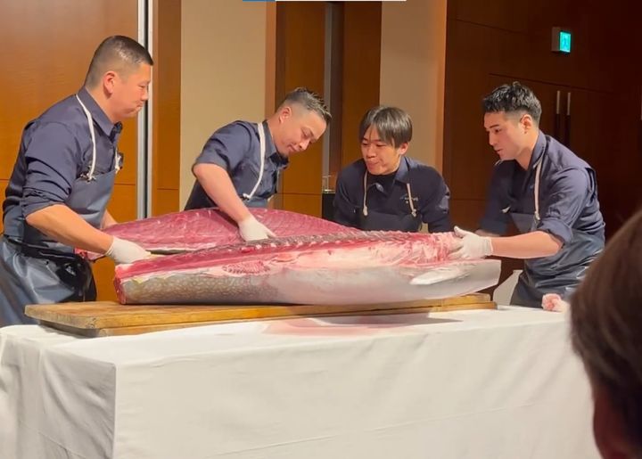 오타니는 자신의 사회관계망서비스(SNS)에 회식 사진과 영상을 올렸다. 영상에는 177㎏의 거대한 참치를 요리사 5명이 해체하는 모습과 다저스의 1루수 프레디 프리먼이 성게 초밥을 먹는 모습이 담겼다.