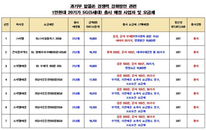 과기정통부는 지난 1월 15일 '알뜰폰 경쟁력 강화 방안'을 발표하고, 도매대가 인하를 통해 알뜰폰 사업자들이 경쟁력 있는 요금제를 설계할 수 있도록 지원했다. 이에 따라 알뜰폰 사업자들은 이날 기준 1만원대 5G 20GB 요금제를 7개 출시한 상태이며, 추가로 더 선보일 예정이다.