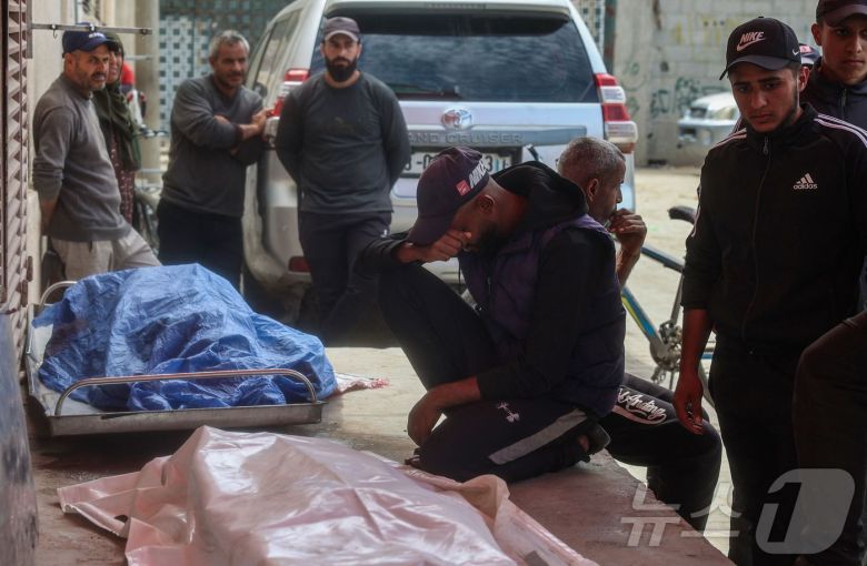 2025년 3월 17일 가자지구 중부 한 병원에서 이스라엘의 드론 공격으로 사망한 팔레스타인 남성 3명의 시신을 애도하는 친척들. ⓒ AFP=뉴스1