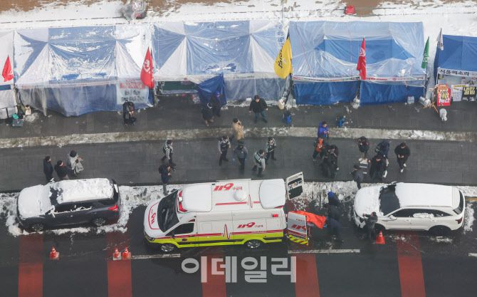 윤석열 대통령의 파면을 촉구하며 단식 중이던 민형배 더불어민주당 의원이 18일 서울 종로구 경복궁 인근에서 병원으로 이송되고 있다.(사진=뉴스1)