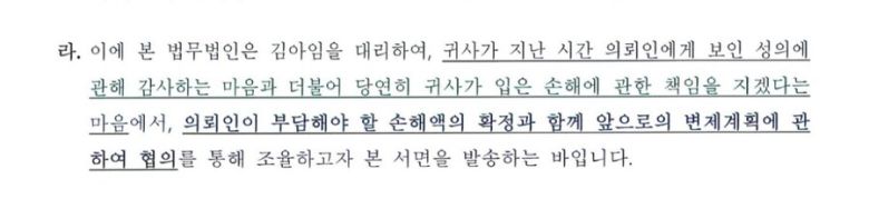 실제로 2차 내용증명을 보낸 다음 날인 3월 26일, 당사의 법률대리인은 당시 김새론 씨의 매니지먼트사와 소통하여 내용증명 우편의 취지를 설명하였습니다. 이에 김새론 씨는 2차 내용증명을 통해 “귀사가 지난 시간 의뢰인에게 보인 성의에 관해 감사하는 마음과 더불어 당연히 귀사가 입은 손해에 관한 책임을 지겠다는 마음에서, 내가 부담해야 할 손해액의 확정과 함께 앞으로의 변제계획에 관하여 협의를 통해 조율하고자 한다“라는 입장을 밝혔습니다.