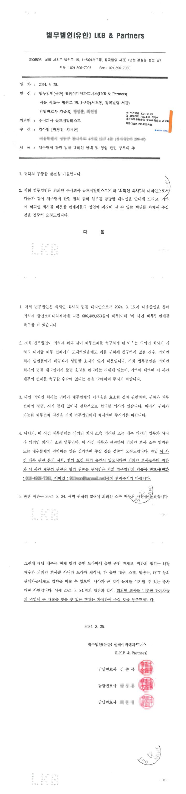 그런데 알려진 바와 같이 김새론 씨가 이에 대해 김수현씨에게 문자를 보냈고, 3월 24일에 SNS를 통해 두 사람의 사진을 올렸습니다. 3월 25일 당사가 보낸 내용증명은 김새론 씨의 우려를 해소하고자 채무 변제를 촉구한 이유를 설명하고, 채무변제와 관련하여 전향적으로 협의할 의사가 있음을 설명하기 위함이었습니다. 아래 첨부한 2차 내용증명과 같이 당사는 김새론 씨에게 “회사가 귀하의 대여금 채무 변제기가 도래하였음에도 이를 귀하께 청구하지 않을 경우, 의뢰인 회사 임원들에게 배임죄가 성립할 소지가 있기 때문”에 2차 내용증명을 보냈음을 설명드렸고, “귀하와 채무 변제의 방법, 시기 등에 있어서 전향적으로 협의할 의사”를 밝혔습니다.