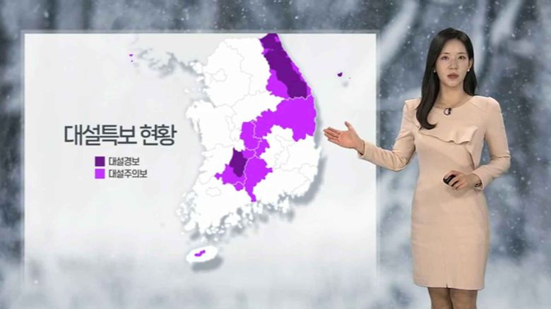 현재 강원 영동과 충청 이남 일부 지역에 대설 특보가 발효 중입니다.