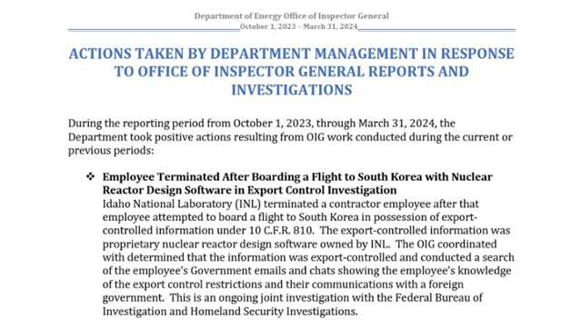 지난해 5월 미국 에너지부 감사관실이 미 의회에 제출된 반기 보고서. 한국이 연루된 미국 원자로 설계 정보 유출 시도 적발 사례가 수록됐다. 미국 에너지부 감사관실 홈페이지 |