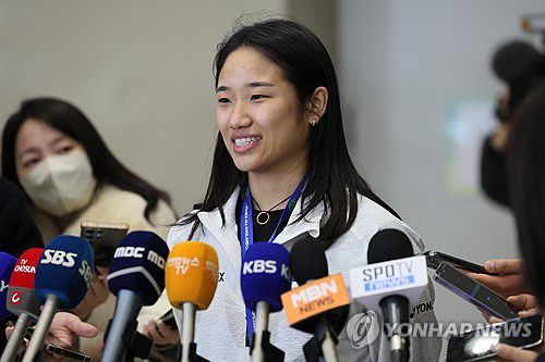 인터뷰하는 안세영(영종도=연합뉴스) 이정훈 기자 = 세계배드민턴연맹(BWF) 월드투어 슈퍼1000 전영오픈에서 우승한 안세영이 18일 인천국제공항 2터미널을 통해 귀국한 뒤 인터뷰하고 있다. 2025.3.18 uwg806@yna.co.kr