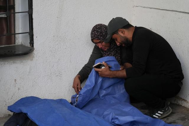 팔레스타인인들이 18일 가자지구 북부 가자시티의 알시파 병원에서 전날 밤 재개된 이스라엘 공습에 따른 사망자 유해를 살펴보며 울고 있다. 가자시티=AP 연합뉴스 |