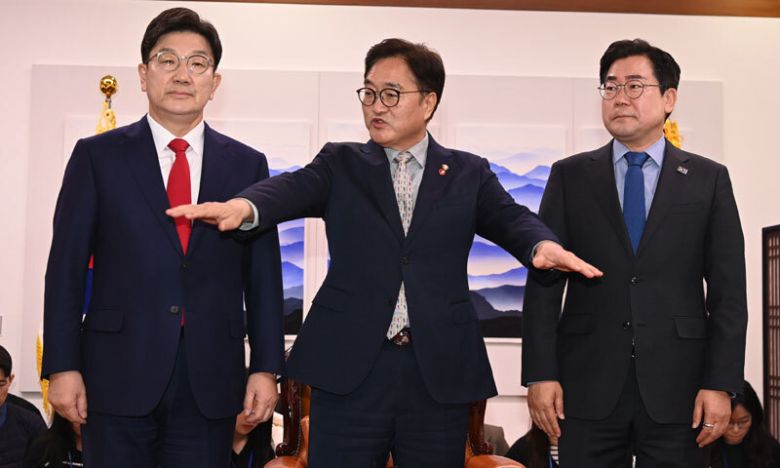 한자리 모였지만… 우원식 국회의장(가운데)이 18일 서울 여의도 국회에서 주재한 여야 원내대표 회동에 앞서 발언하고 있다. 왼쪽부터 국민의힘 권성동 원내대표, 우 의장, 더불어민주당 박찬대 원내대표. 연합뉴스 |