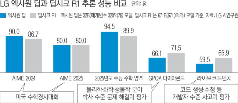 한국어가 강점인 엑사원 파운데이션 모델을 기반으로 하는 32B 모델은 2025학년도 대학수학능력시험 수학 영역에서 94.5점으로 딥시크 R1(89.9점)을 앞섰다. 과학, 코딩 분야 성능 테스트에선 딥시크에 밀렸지만 경쟁력 있는 성능을 보였다. 물리학·화학·생물학 분야 박사 수준의 고난도 문제 해결 능력을 측정하는 GPQA 다이아몬드 평가에서 엑사원 딥은 66.1점, 딥시크 R1은 71.5점을 받았다.