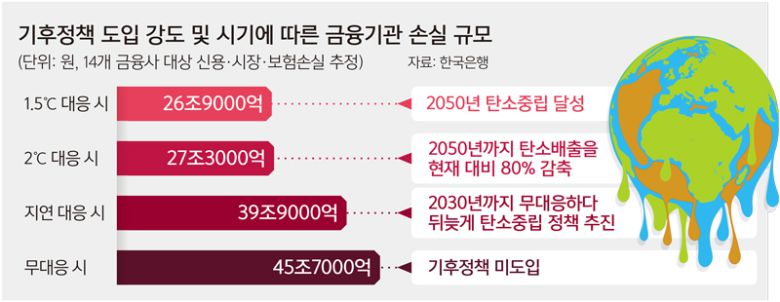 기후변화 위험에 대비하지 않을 경우 은행과 보험사 등 금융기관들의 손실이 2100년까지 45조7000억원에 이를 것이라는 연구 결과가 나왔다. 이상 기후로 인한 각종 비용뿐 아니라 탄소세, 탄소국경조정제도(CBAM) 등에 대비하지 않은 기업의 경쟁력 저하가 신용 및 대출 부실로 이어져 금융기관에까지 막대한 손실을 가져온다는 것이다.