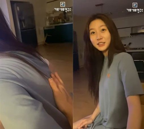 김새론은 "내가 볼 때 이거 배에 하면 죽어. 고양이 등에 테이프 붙인 느낌이야"라고 말했다. 이어 TV를 보다가 계속해서 촬영을 하는 남성을 향해 "나 찍어, 계속?" 이라고 물었다.